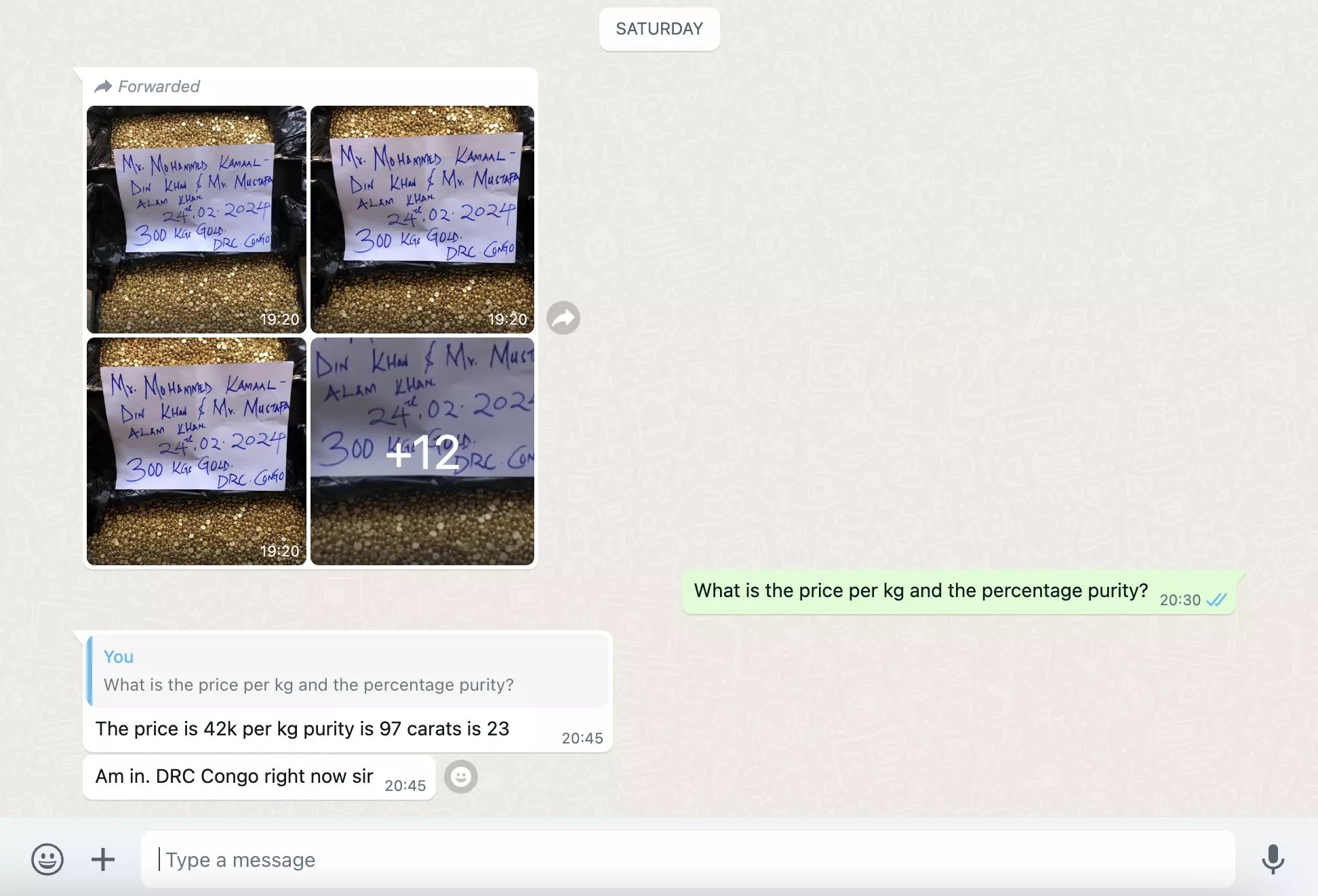 If you succumb to the temptation to pursue any of these "offers" you'll be drawn into an imaginative series of stories aimed at obtaining anywhere from as little as just USD 200 for the scammer (still enough of a victory as to merit the WhatsApp correspondence and a few days building trust) for a bogus flight from say, Goma to Kampala, that will obviously never actually be taken, to as much as say, USD 18,000 to "release" the product, where a super-polite, gentle, modest-sounding and well-spoken Kenyan / Ugandan / Rwandan / Congolese scammer will convince you that there's just a little, easily surmountable hitch in that the previous buyer reneged on the deal and the product has had to remain in safe-keeping in a bonded safe-house in Kampala for say, the last six weeks, during which time it became apparent that the previous buyer's funds were inextricably tied up with a clearing agent in Kampala, (which is why you should probably use the scammer's own clearing agent if you advance the "deal" - to avoid suffering the same pitfall) and he was unable to complete, but don't worry: they're ready to bring you the product to Dubai or else to have you come and test and collect it in Kampala; all they will need are the mere storage fees that have already been incurred of just USD 2 per kg per day at 45 days for each of the 200 kg in the consignment, totalling just USD 18,000 - a wonderful payday for the scammer, and which probably will only result once you have flown to Kampala and tested the product (which is, of course, already owned by someone else who has absolutely no idea you're looking at it and thinking you can buy it).